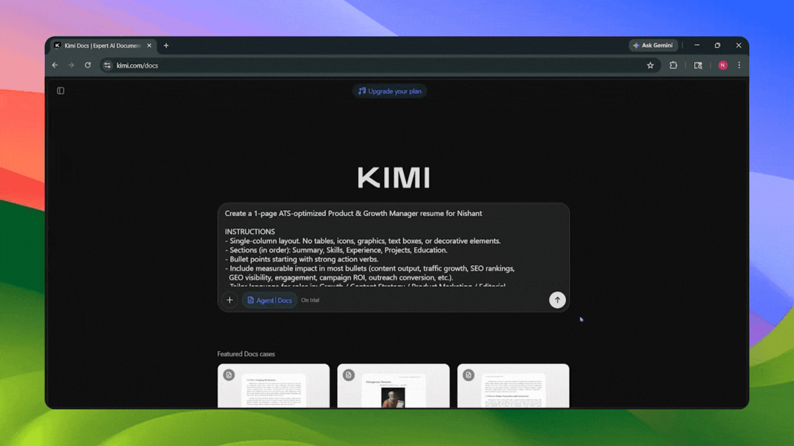 Kimi Agent, Kimi's productivity-oriented mode, can help you generate a formatted, professional .docx resume from a single conversational prompt. You can drop in your background, and Kimi will return a polished CV complete with formatted sections, clean typography, and optional headshot placement.